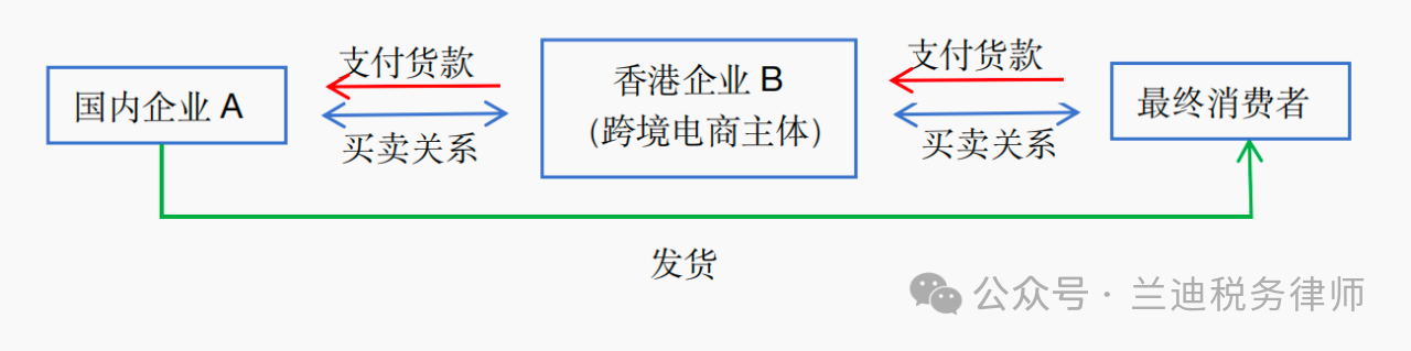 为了降低出口退税的风险,有的跨境电商企业采用如下的业务模式,即国内企业以一般贸易形式将货物销售给香港关联企业B,作为跨境电商主体的香港企业B在跨境电商平台上销售货物给最终消费者,由国内企业A直接发货给最终消费者。