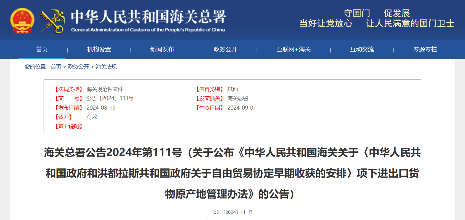 为了正确确定《早期收获》项下进出口货物原产地,促进我国与洪都拉斯的经贸往来,海关总署制定了《中华人民共和国海关关于〈中华人民共和国政府和洪都拉斯共和国政府关于自由贸易协定早期收获的安排〉项下进出口货物原产地管理办法》(海关总署公告2024年第111号)(以下简称《办法》),2024年9月1日起施行。
